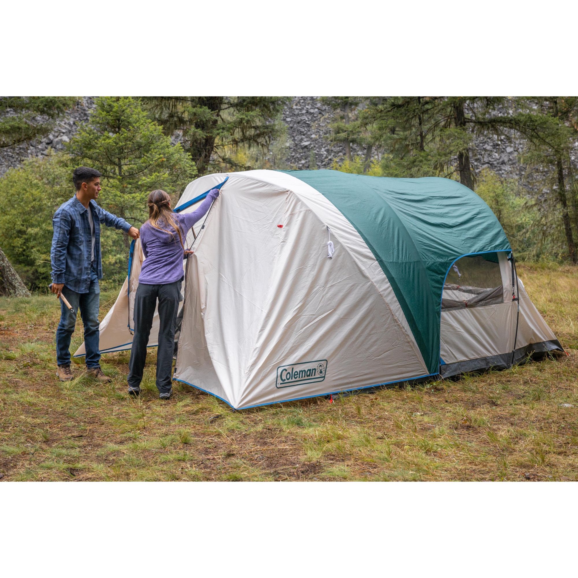 Coleman 6 person cabin tent with screened porch, 2 rooms, green.
